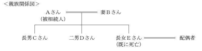 FP3級学科問題 2022年9月58 FP3級学科問題 2023.10.06 【第1問】 次の各文章((1)~(30))を読んで、正しいものまたは適切なものには①を、誤っ ているものまたは不適切なものには②を、解答用紙にマークしなさい。〔30問〕(58) 下記の<親族関係図>において、Aさんの相続における長男Cさんの法定相続分は、( )である。1) 3分の1 2) 4分の1 3) 6分の1 番号を選択2) 4分の1 57問目 法定相続 59問目