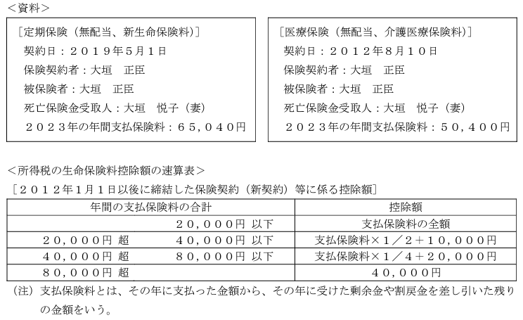 大垣正臣さんが2023年中に支払った生命保険の保険料は下記<資料>のとおりである。この場合の正臣さんの2023年分の所得税の計算における生命保険料控除の金額として、正しいものはどれか。なお、下記<資料>の保険について、これまでに契約内容の変更はないものとする。また、2023年分の生命保険料控除額が最も多くなるように計算すること。