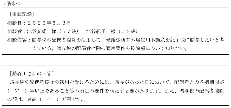 FPで税理士でもある長谷川さんは、池谷光雄さんと妻の紀子さんから贈与税の配偶者控除に関する相談を受けた。池谷さん夫婦からの相談内容に関する記録は下記<資料>のとおりである。この相談に対する長谷川さんの回答の空欄(ア)、(イ)にあてはまる数値の組み合わせとして、最も適切なものはどれか。