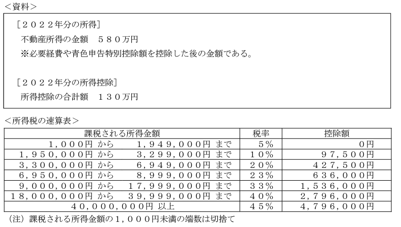 落合さんは、個人でアパートの賃貸をしている青色申告者である。落合さんの2022年分の所得および所得控除が下記<資料>のとおりである場合、落合さんの2022年分の所得税額として、正しいものはどれか。なお、落合さんに<資料>以外の所得はなく、復興特別所得税や税額控除、源泉徴収税額、予定納税等については一切考慮しないこととする。