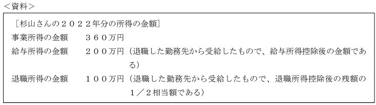 FP3級実技問題 2022年9月12 FP3級実技問題 2023.10.292023.11.01 杉山さんは2022年中に勤務先を退職し、個人事業主として美容室を始めた。杉山さんの2022年分の各種所得の金額が下記<資料>のとおりである場合、杉山さんの2022年分の所得税における総所得金額として正しいものはどれか。なお、杉山さんの2022年中の所得は<資料>に記載されている所得以外にはないものとする。 1. 660万円 2. 560万円3. 460万円 番号を選択2. 560万円 11問目 総所得金額 13問目