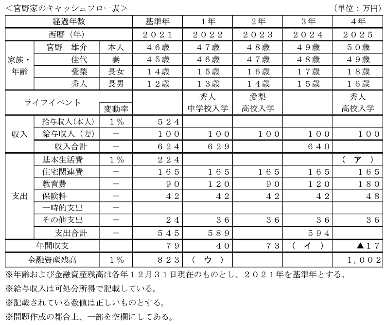 FP3級実技問題 2022年5月02 FP3級実技問題 2023.10.302023.10.31 下記は、宮野家のキャッシュフロー表(一部抜粋)である。このキャッシュフロー表の空欄(ア)~(ウ)にあてはまる数値として、最も不適切なものはどれか。なお、計算に当たっては、キャッシュフロー表中に記載の整数を使用し、計算結果については万円未満を四捨五入すること。 1.空欄(ア):233 2.空欄(イ): 46 3.空欄(ウ):831 番号を選択3.空欄(ウ):831→871万円 1問目 キャッシュフロー 3問目