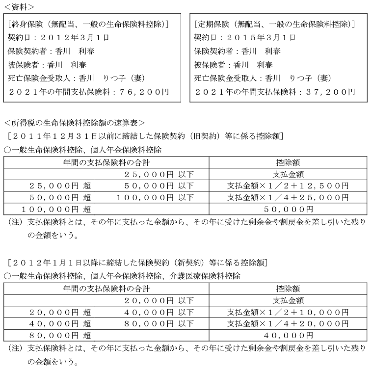 香川利春さんが2021年中に支払った生命保険の保険料は下記<資料>のとおりである。この場合の利春さんの2021年分の所得税の計算における生命保険料控除の金額として、正しいものはどれか。なお、下記<資料>の保険について、これまでに契約内容の変更はないものとする。また、2021年分の生命保険料控除額が最も多くなるように計算すること。 1. 40,000円
